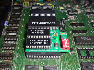 The third use comes with older PETs with BASIC 1 or 2, or with less than 32K of RAM. The ROM/RAM board can contain multiple ROM images, so it can be used to upgrade these systems to BASIC 4 and 32K or RAM, or any combination down to BASIC 1 and 8K. This is how my 2001 system is setup.
