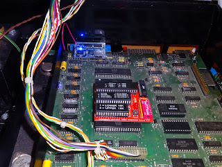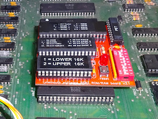 These are the new, red V3.1 boards, and feature an activity LED, reset switch. There are three scenarios where one of these boards is useful, as a diagnostic tool, as a ROM/RAM replacement or as a system upgrade. The original use is as a diagnostic tool. ROM and RAM are common causes of failure on vintage computers, and this is an easy way to rule out problems with the original ROM or RAM, buffering, multiplexing or address decoding. If it turns out there are faults with the original ROM or RAM, and replacements are not available, or too expensive, the board can be left in place. In these situations, you can remove all the onboard ROM and RAM and just run with the ROM/RAM board, reducing power consumption and heat generation inside the case.